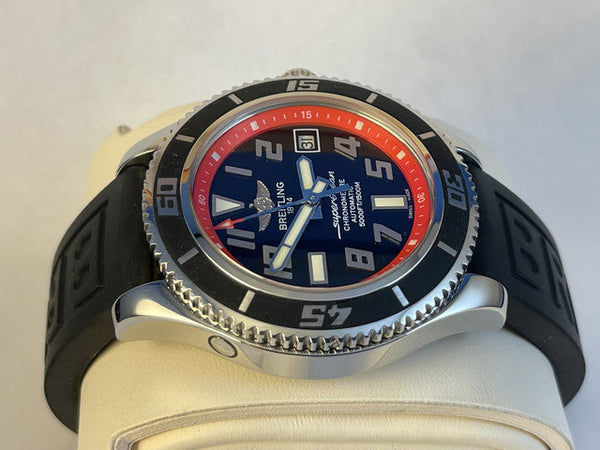For sale is the robust and stylish Breitling Superocean 42, reference A17364. Designed for underwater explorers, this timepiece combines professional-grade dive features with a sleek and sporty design, perfect for both adventures and everyday wear.